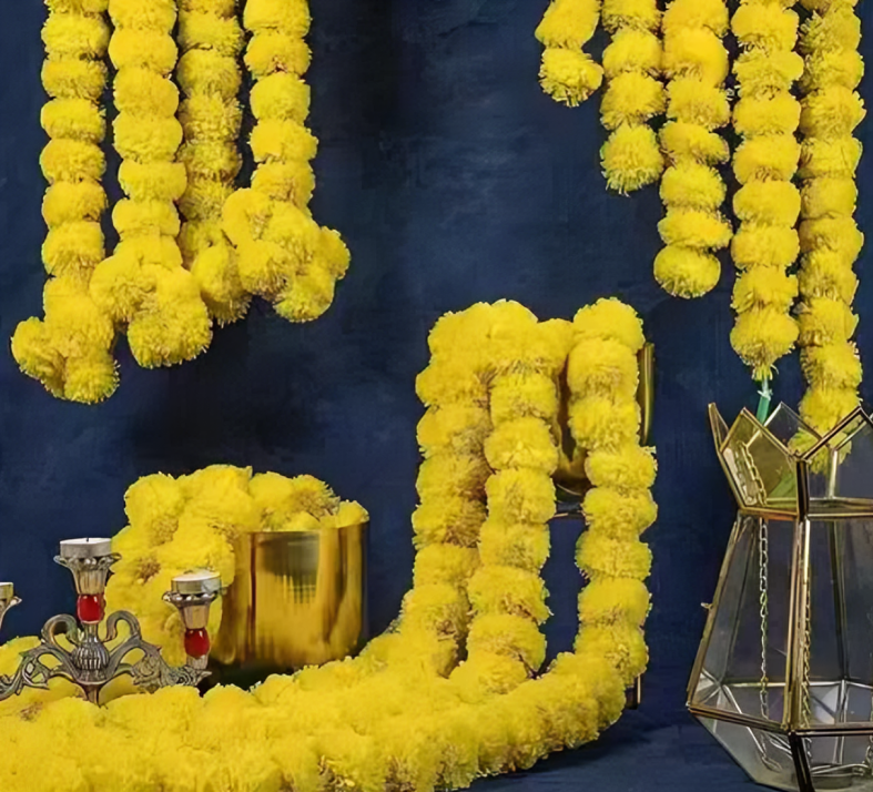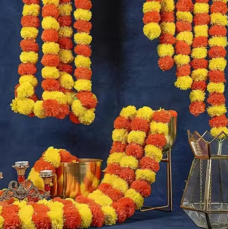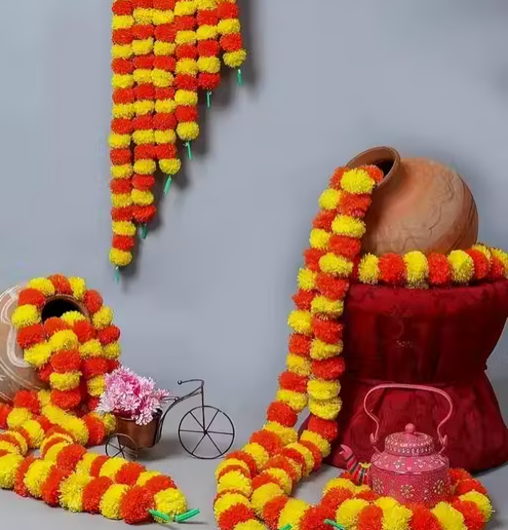 Name: Artificial Marigold Fluffy Flowers Wall Hangings/Latkans for Decoration – Diwali & Pooja – Approx 4.5 ft (Pack of 5) (Multicolour)